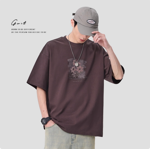 GWIT 复古重磅国潮花卉印花夏季体恤情侣半袖潮牌纯棉短袖T恤男