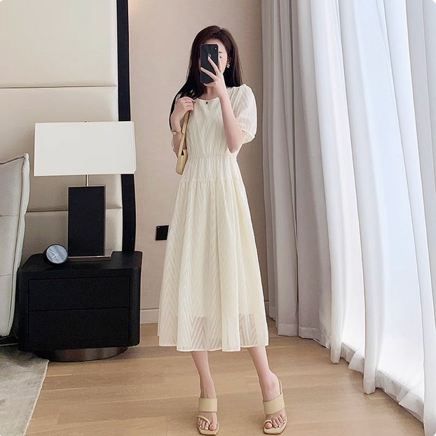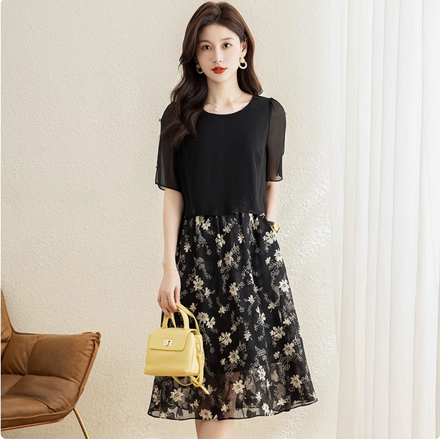 小个子雪纺连衣裙女夏季2025新款优雅圆领修身气质显瘦a字裙子女