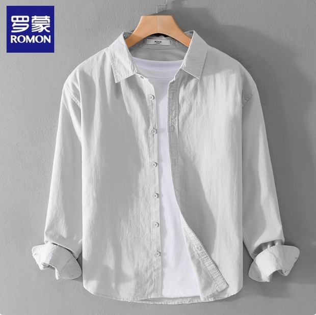 罗蒙男士休闲长袖衬衫日系纯色简约百搭上衣服春秋季纯棉衬衣外套