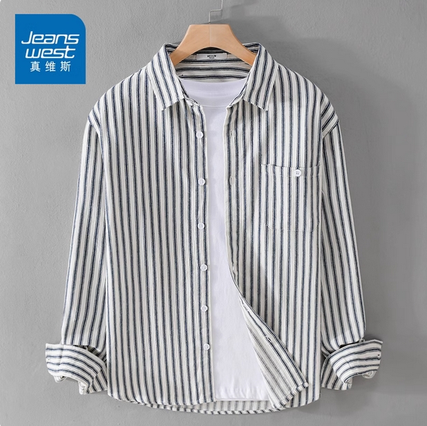 真维斯2025春秋季纯棉条纹衬衫男士夏季长袖衬衣宽松休闲外套男生