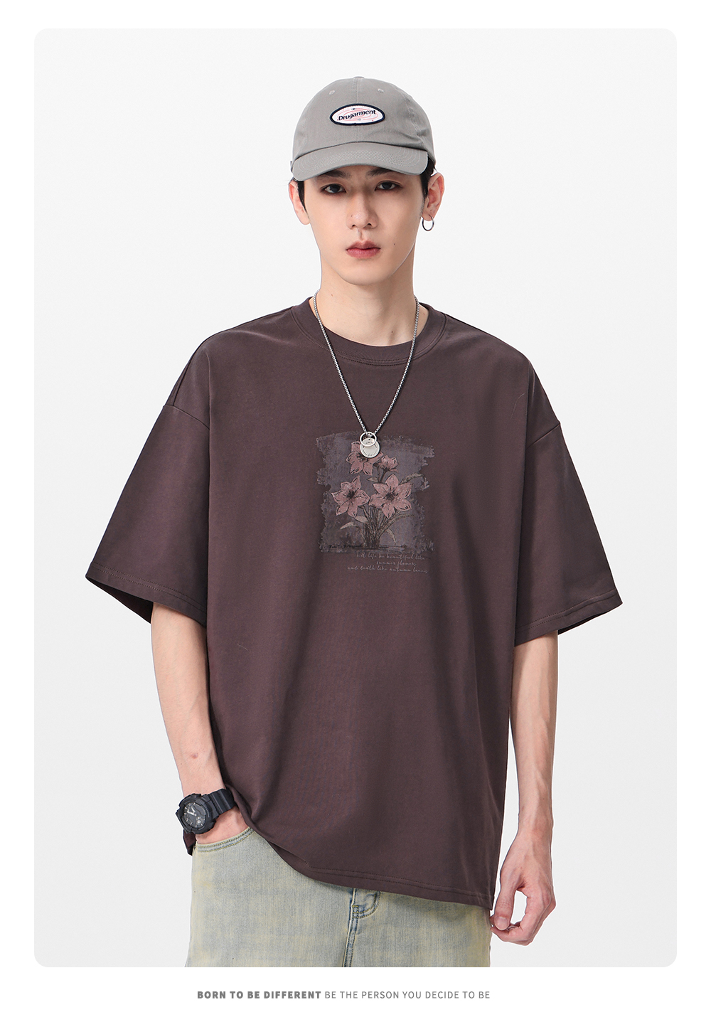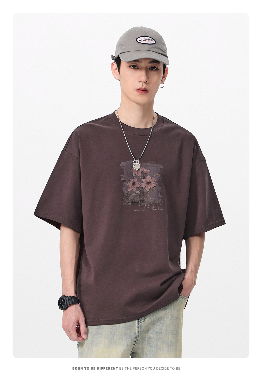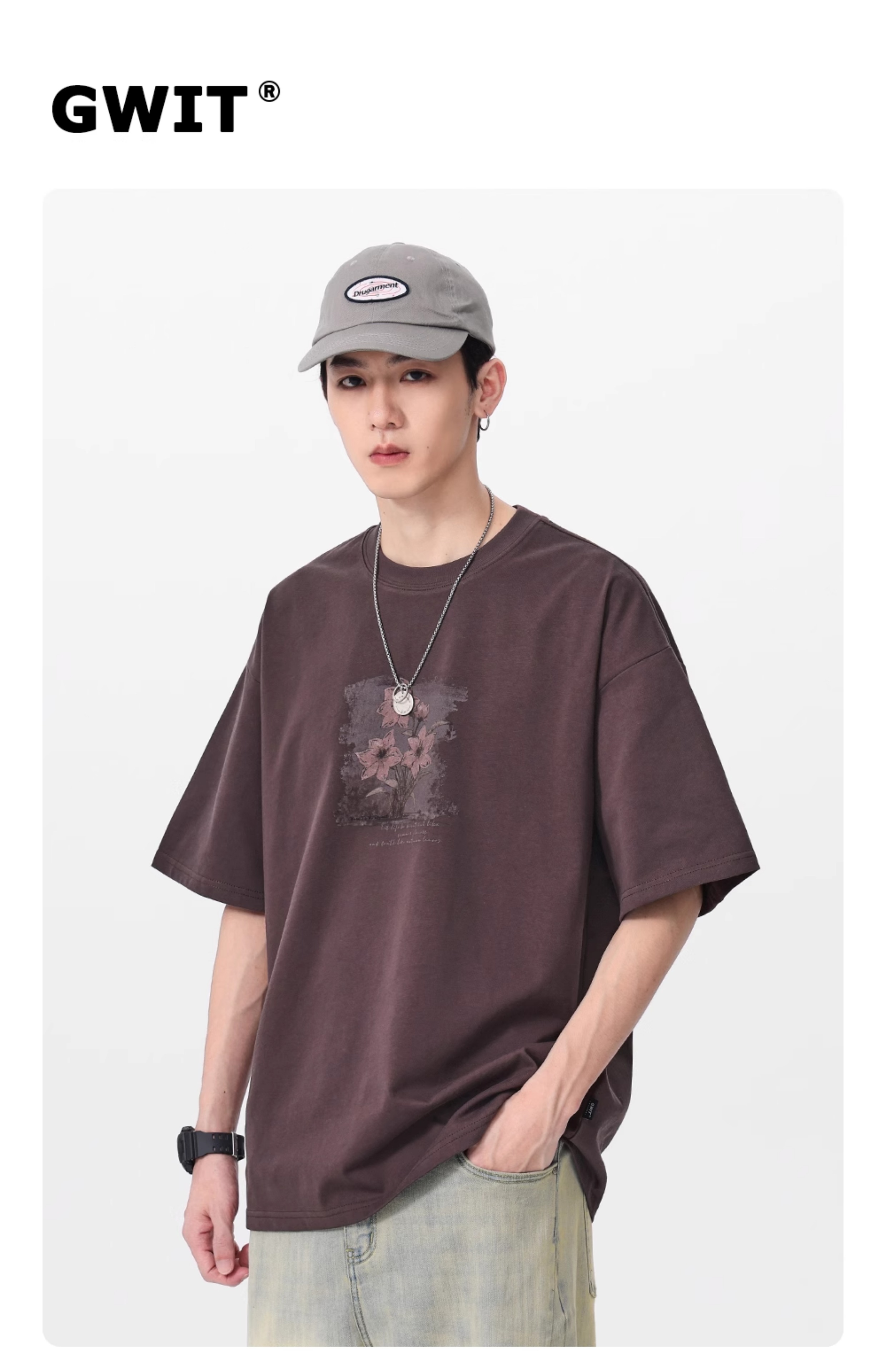 GWIT 复古重磅国潮花卉印花夏季体恤情侣半袖潮牌纯棉短袖T恤男